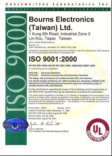 质量认证证书: BOURNS9001认证